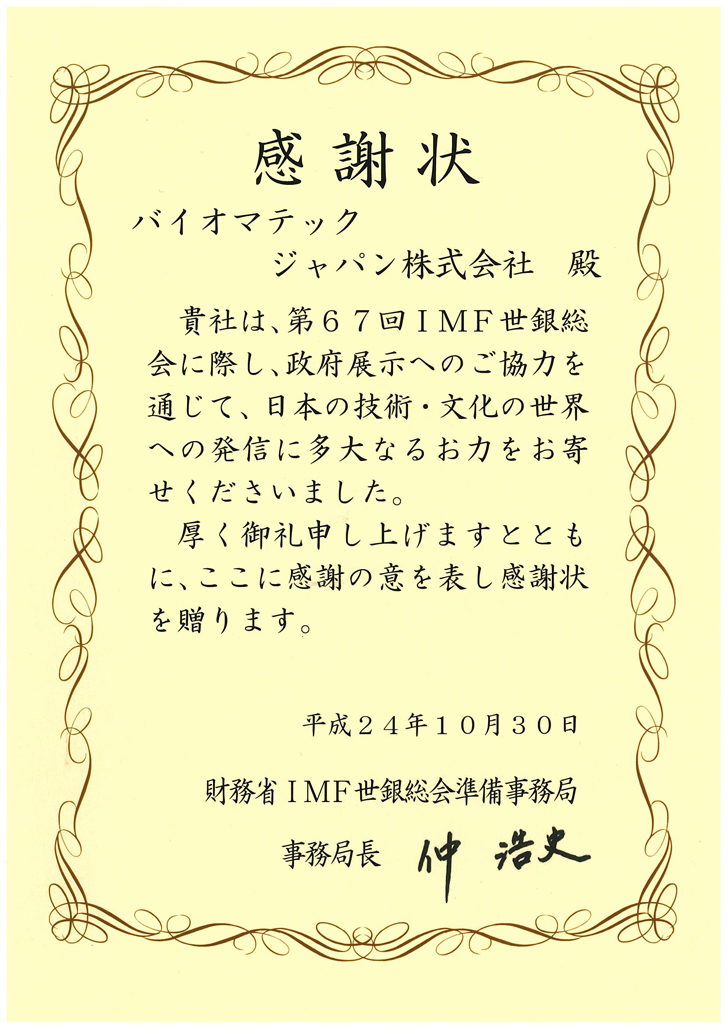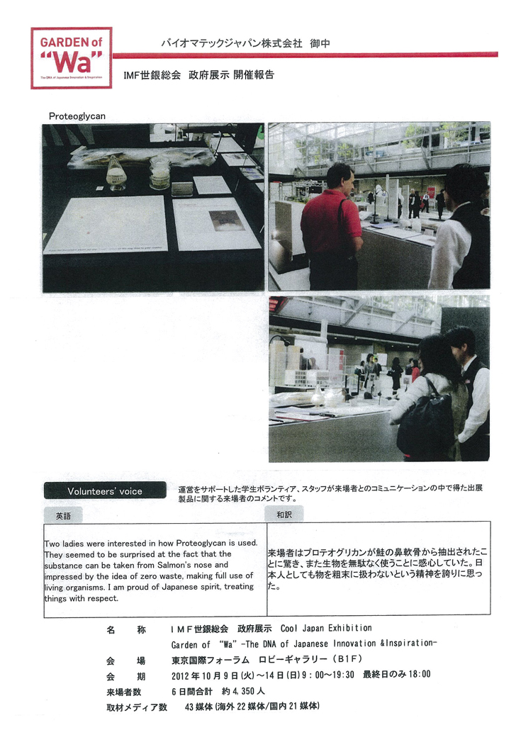 平成24年10月9日から14日まで東京有楽町の国際フォーラムをメイン会場として開催された「2012 IMF・世銀年次総会」の国際会議において、当社のプロテオグリカンが財務省の推薦を受け、日本を代表する文化・技術のひとつとして政府展示されました。